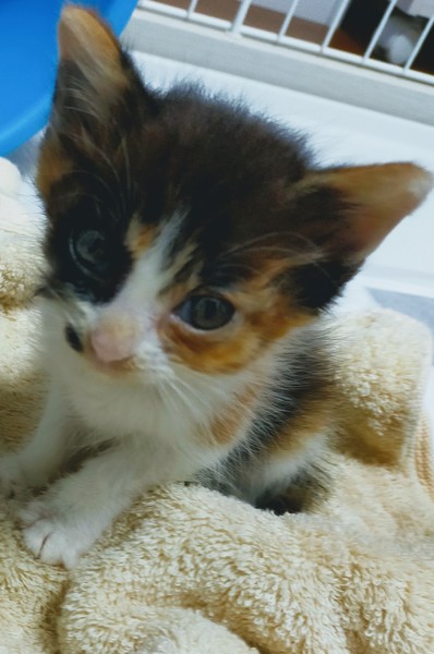 | 里親募集する理由 | 真夏日の先週、衰弱して動けないでいる所を高校生の息子が保護しました。 衰弱が激しく頬に傷、片目が開かない状態でした。 病院でノミダニ薬、頬、目の治療をしてもらいました。ほっぺは一部毛を刈ってます。点眼もしています。 現在は食欲も出て目も開き猫らしい姿を見せてくれるまでになりました。 とても可愛い子で我が家で迎えたいのですが先住犬、家族の猫アレルギーがあり難しく大切にして頂ける方にお迎え頂きたいです。 |