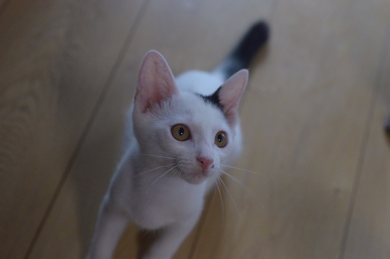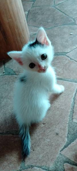 | 特徴(性格など) | 全体的に白猫で黒い斑点がところどころにあるとても可愛い子です。 元気に走り回っています。とても人が好きでくっついてスリスリゴロゴロです。他の猫とも仲良くできて犬も大丈夫です。小さめで可愛くて愛されキャラです。 |