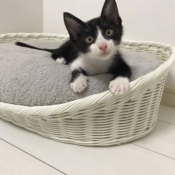 | 特徴(性格など) | 生後2ヶ月位。 黒多めの白黒ハチワレの男の子。 鼻筋の通ったイケメン猫さんです。 車道に出てしまい車に轢かれそうになって いたところを保護しました。 人間も猫も大好きですぐにゴロゴロいう 甘えん坊です。おしゃべりでよく鳴きます。 呼んだら鳴きながら走ってきます。 毎日元気に走り回って猫とニャンプロして遊ぶのが大好きなので若い猫ちゃんのいるお家がいいかもしれません。 寝る時、お留守番の時はケージに入って静かにできる賢い子です。6時間くらいならお留守番できます。 |