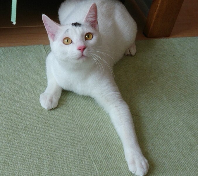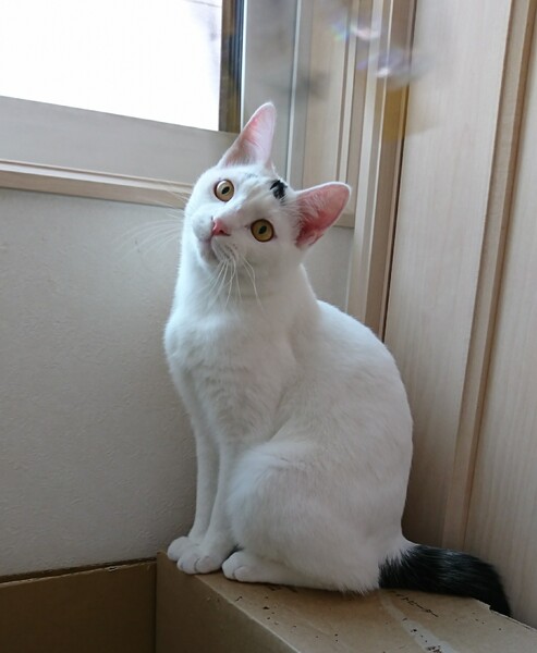 | 特徴(性格など) | なめらかな手触りの短毛猫です。 ほとんど白い毛ですが、尻尾と頭の模様が黒いチャームポイントになっています。 尻尾はギザギザとしたカギしっぽです。 怖がりな性格ですが、人と暮らすことに少し慣れてきました。抱っこは出来ます。 活発でオモチャが大好きです。飛び跳ねてよく遊びます。 |