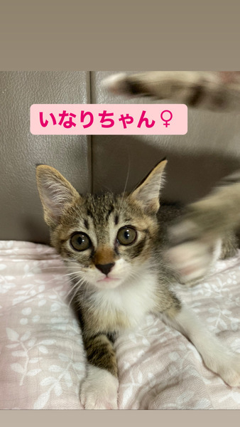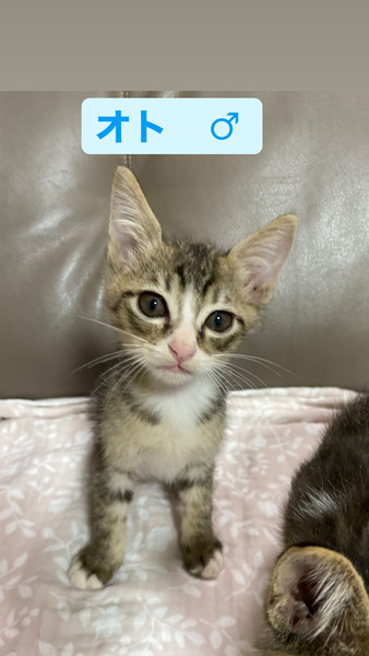 | 特徴(性格など) | ミルクで育てましたので人が大好き 天真爛漫な兄妹です。 目が大きくて足先が白い子…オトちゃん♂ 愛らしい顔したキジ白……いなりちゃん♀ 保護した時は220gでガリガリでした。 ミルクから育て、すくすくと成長し大した問題もなく離乳しドライフードへと移行しました。 体重650gです ウィルス検査陰性 駆虫済みです |