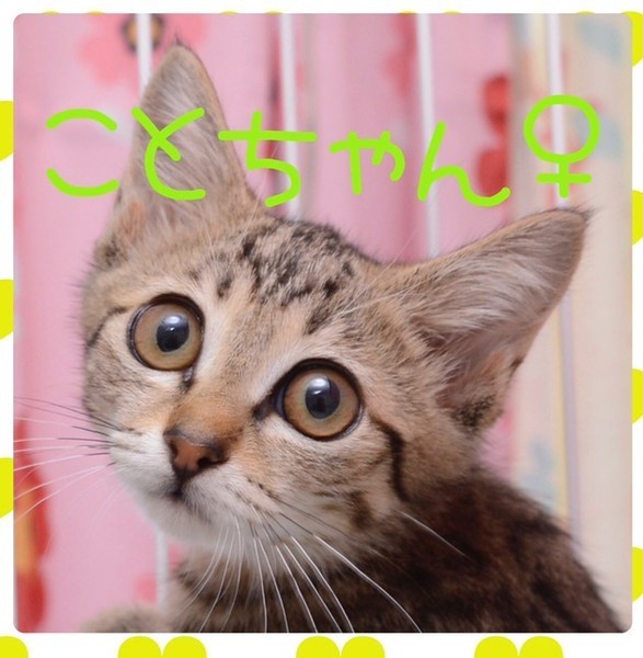 | 特徴(性格など) | 茶系キジ猫 4きょうだいの1匹です クリクリした目が特徴の優しい子です 猫エイズ、猫白血病ウィルス 陰性 3種ワクチン1回接種済み |