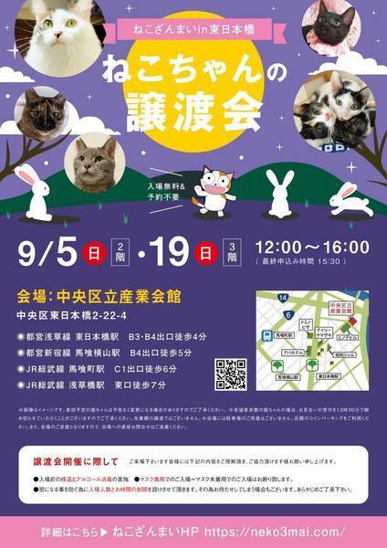 | その他(譲渡条件など) | 【新型コロナウィルス感染予防対策について】 譲渡会開催に際し、ご来場下さいます皆様には以下の内容をご理解頂き、ご協力頂けます様お願い申し上げます。 ●入場前の検温とアルコール消毒の実施 ●マスク着用でのご入場=マスク未着用でのご入場はお断り致します ●入場人数の制限をさせていただきます ●時間と人数の制限=密になる事を防ぐ為に入場人数とお時間の制限を設けさせて頂きます その為お待たせしてしまう場合もございます ●会場利用規約により、ご来場者様の連絡先を控えさせていただきます あらかじめご了承下さい 里親様決定は14時以降となります。 その後、迎え入れ準備の説明等のお時間も頂戴しますので、お時間に余裕を持ってご来場下さい。 諸々の制限がございますが、安心・安全な譲渡会運営のためにご理解・ご協力いただきますようお願い申し上げます。 ~~~~~~~~~~~~~~~~~~~~~~~~~~~~~~ ★仔猫ご希望の里親様★ 仔猫ちゃんたちは、まだ体がしっかりしていない赤ちゃんです。 下痢だけでも数時間対応ができなかっただけ死に至る事もあります。 その為、月齢に応じたお留守番時間を設けさせていただいております。 また、子猫ちゃん(6ヶ月未満)の里親様には子猫支援金のご協力をお願い致しております。 ★猫ちゃんとのお見合いは譲渡会で!★ ねこざんまいの猫ちゃんは譲渡会でのお見合いのみとなります。 『この子はいつ譲渡会に参加するの?』『譲渡会場の場所はどこ?』など はねこざんまいホームページをご覧ください。 https://neko3mai.com/ ★楽しく猫ちゃんと触れ合って★ ねこざんまい譲渡会は、猫ちゃんも里親様も保護主も笑顔で過ごせる譲渡会を目指しています。 これから20年以上、楽しい時も、悲しい時もいつも傍にいてくれる大切な家族になる猫ちゃんです。 会場には沢山の猫ちゃんがいます。 1匹1匹、触れ合って猫ちゃんとお話ししてください。 『初めて猫ちゃんを家族に迎える方』 『先住猫ちゃんのお友達を迎える方』など トライアルの仕方や先住猫ちゃんと仲良くなるコツなど経験豊富な保護主やスタッフにお気軽にご相談ください! 猫を愛し、そして猫に愛されている猫好きスタッフと保護主がアドバイスさせていただきます。 ★里親希望のみなさまへ★ ペットではなく、家族一員としてたっぷり愛情を注いでくださるご家庭をお待ちしております。 恐れ入りますが、 ・学生の方 ・一人暮らし、同棲中の方 ・子猫、若猫希望の60歳以上のみのご家庭 ・脱走防止対策にご協力いただけない方 は原則譲渡を遠慮させていただいております。 ただし、預かりボランティアさんとして新しい家族が決まるまでの間、猫ちゃんを預かっていただく道もございます。 参加猫ちゃんは、それぞれ保護主(実際に猫ちゃんを自宅に入れ、保護をしている方)が異なります。 詳しい条件なども異なる場合がございますので、会場内で直接保護主とお話ください。 〖共通条件〗 1.終生飼育 2.完全室内飼い 3.脱走防止対策へのご協力 4.避妊去勢手術 5.契約書類へのサイン 6.定期報告 7.医療費等の負担 当日の猫ちゃんを連れて帰ることはできません。後日、保護主が里親様のご自宅までお届け致します。 その為、移動の際の猫ちゃんの負担を月齢などから考慮し、お届け地区を限定させて頂くこともございますのでご了承ください。 ご理解とご協力のほど宜しくお願い致します。 ☆よくある質問☆ ・譲渡の条件 ・ご負担頂く費用 ・譲渡会の場所等は ホームページに詳しく掲載させて頂いておりますのでご覧ください。 https://neko3mai.com/ メールでのお問い合わせはすぐにご返答出来ない場合がございますのでご了承ください。 ホームページ https://neko3mai.com/ お問い合わせ http://www.neko3mai.com/contact/form_general.html ねこざんまいブログ http://ameblo.jp/neko3mai/ |