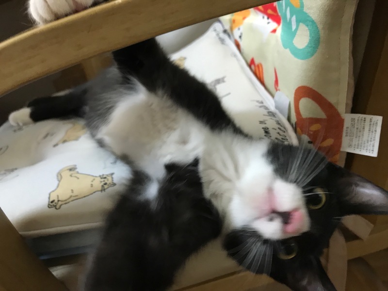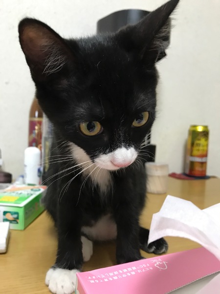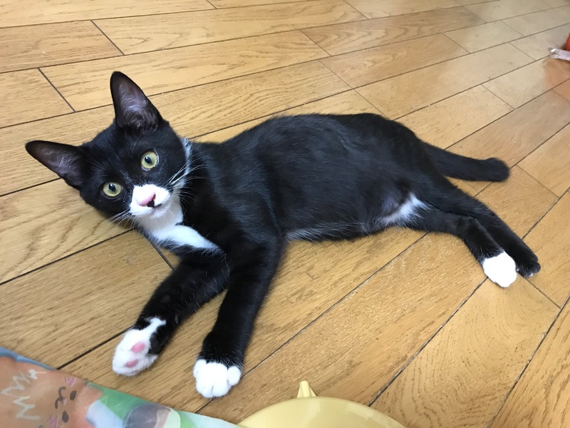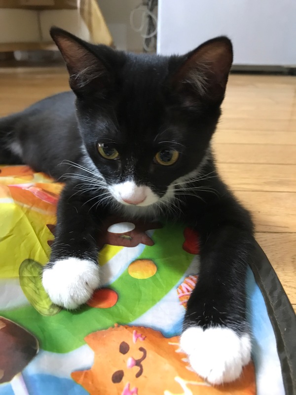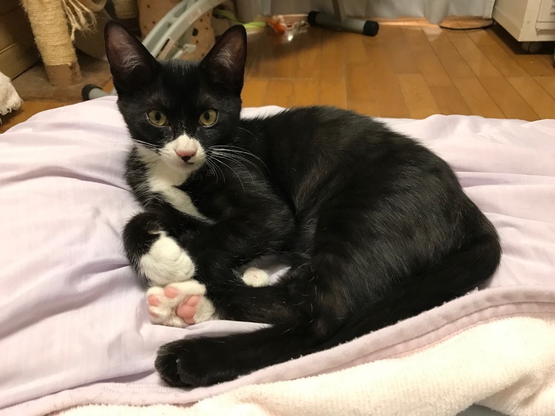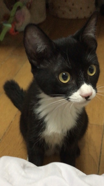 | 特徴(性格など) | メスの黒白子猫。ピンク鼻・ちょび髭ありです。前に2足、後ろに1足、白ソックス履いてます。 白ソックスの肉球はピンクでひとつだけ黒。モリモリの食べ盛りで、おもちゃは命、毎日駆けずり回ります。 お転婆で気が強く、初対面の人間にはシャーですが、あの手この手のエサで釣ればすぐ慣れます。 おしゃべりも出来ますので、少々やかましいですが、元気さ余って可愛さ100倍! エイズ・白血病陰性。 |
