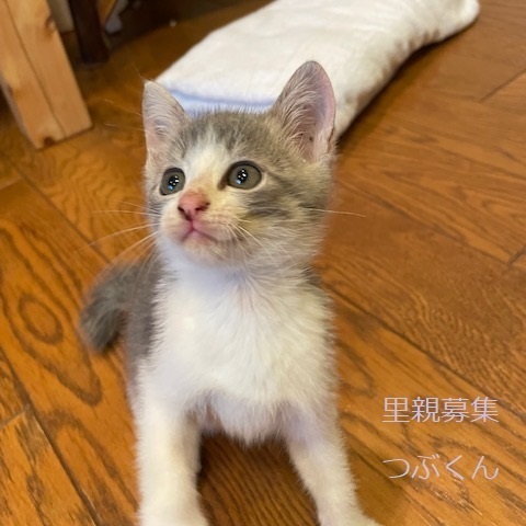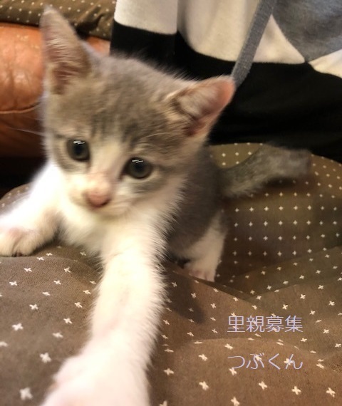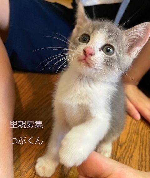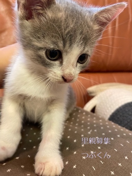 | 特徴(性格など) | グレー白子猫、男の子、仮名:つぶくん 推定生後一か月半くらい、体重:687g(8/20現在) 健康診断済み、フロントライン済み(8/14)、検便済み(8/17) 血液検査-エイズ・白血病-ともに陰性(8/17) ワクチン近日予定。 トイレしつけ済み 元気で甘え上手、周りがうるさくてもいつの間にか寝ているマイペースねこちゃんです 9/11、初回三種混合ワクチン接種済み。 |