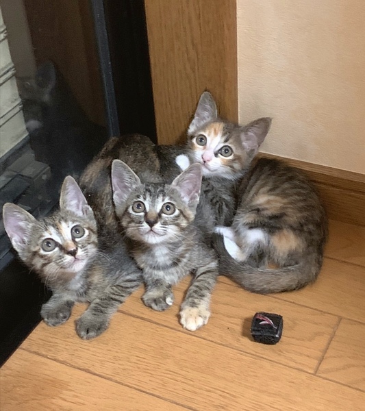 | 特徴(性格など) | 生後1ヶ月半くらいになる3姉妹(キジ、三毛、ムギワラ)です。 子猫たちは少し前まで、母猫のもとで母乳だけで育っていますが、ドライフードに切り替えても問題なし。まだ保護して浅いですが、日に日におうち生活にも順応して表情のこわばりも取れてきました。 仲よく元気に遊んで、走り回ってはこてんと眠り、子猫らしく過ごしています。 姉妹いっしょにお迎えくださる方歓迎します。 ◆健康状態 ★良好です ・エイズ&白血病ウイルス陰性 ・レボリューションスポット済み ・プロフェンダースポット済み ・検便チェック問題なし ・3種混合ワクチン1回目接種済み |