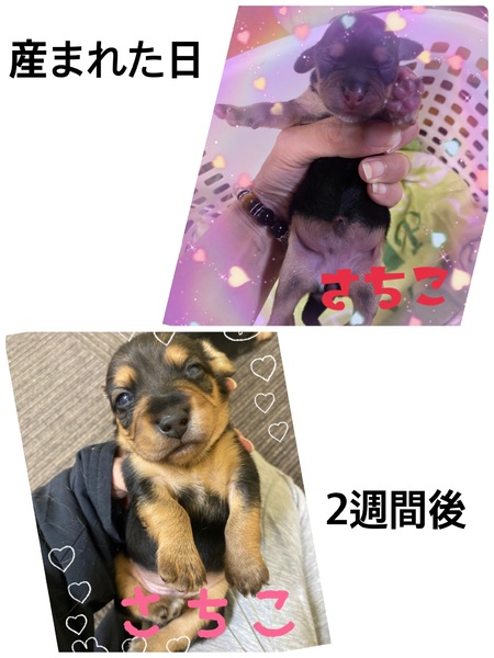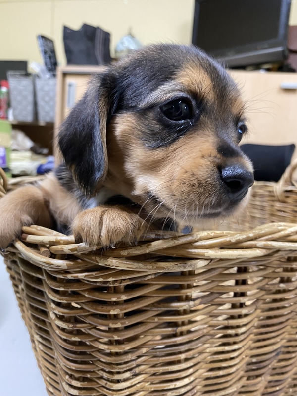 | 特徴(性格など) | 色柄は、黒色にベージュのタンがあり 胸の所に少しだけ白い模様があります。 小ぶりながら、しっかり食べ元気いっぱいで好奇心旺盛、起きている時はいつも他の仔犬とじゃれています。 母犬はビーグル犬で、父犬は申し訳ありませんが分かりません。 柄の出方から推測するとミニチュアダックスフントの可能性が大きいかと思われます。 |