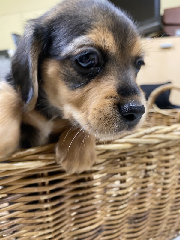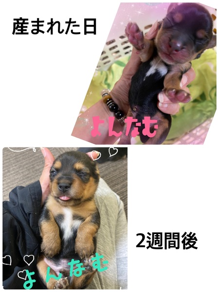 | 特徴(性格など) | 色柄は、黒色にベージュのタンがあり 胸の所に白い模様が十字に入っています。 小ぶりながら、しっかり食べ元気いっぱいで好奇心旺盛で少しやんちゃです。 母犬はビーグル犬で、父犬は申し訳ありませんが分かりません。 柄の出方から推測するとミニチュアダックスフントの可能性が大きいかと思われます。 |