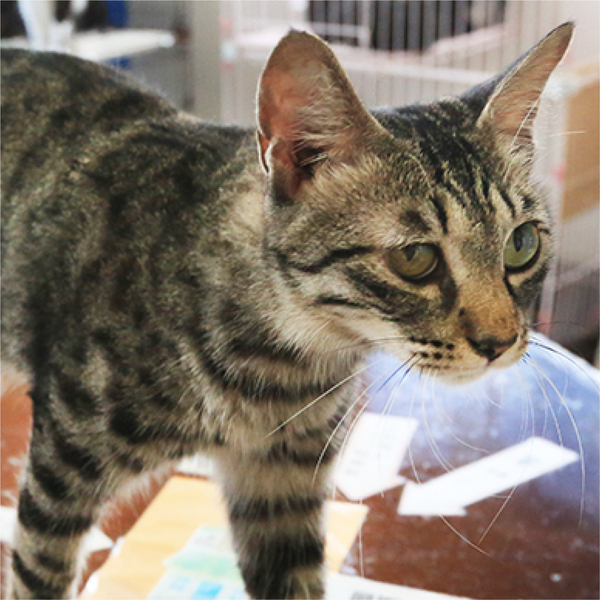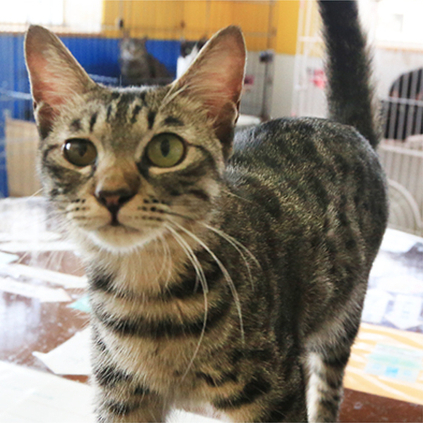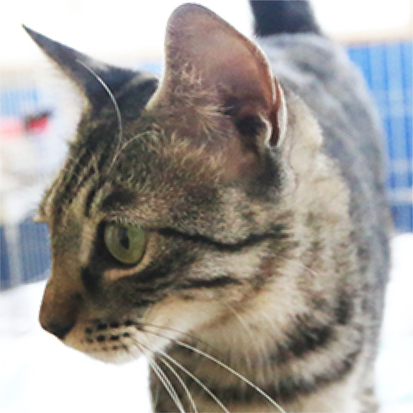 | 特徴(性格など) | 「ぽやっ」としていて、おっとりした小柄な女の子です。 寄ってきて触れることはできますが、だっこや膝のりは好きではありません。見た目に反して意外とクール、でもそこがキジトラ女子らしいかわいい子です。尻尾はまっすぐ。体の割には少し太くて長いです。目のサイズが左右で違い、色も右目の方が濃い色をしているのもこの子の唯一無二の魅力の一つです。 おもちゃ遊びも好きで、すこしゆっくり目の全然痛くなさそうなパンチが炸裂します。 ぜひ本館に遊びに来て下さい♪ 子猫の時の猫風邪の影響で右目がしぱしぱしています。 涙も出やすいです。 その他の健康状態は良好です。 |