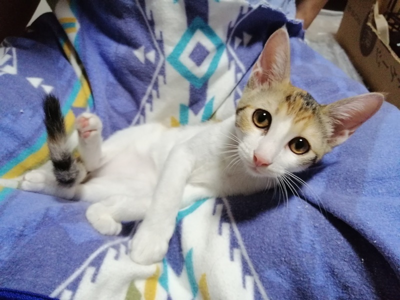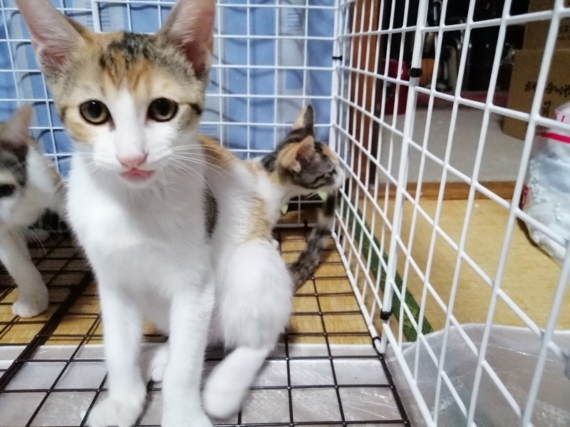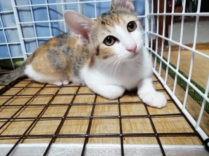 | 特徴(性格など) | 健康状態は、元気で問題ありません。 保護して三週間ほどですが、姉妹の中でも最も人慣れして、いつもゴロゴロと甘えてきます。 きれいな白ベースの三毛で、色のバランスも整っていると思います。 ぱっちりした目と大きめの耳がチャームポイントです。 |