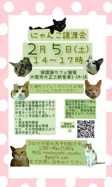 | その他(譲渡条件など) | 譲渡会に参加させて頂きます☆ 詳細は 7枚目の画像をご覧ください(*^^*) <譲渡会情報> にゃんこ譲渡会 @保護猫カフェ猫宿主催・運営 日時 2022年2月5日(土) 午後2:00~午後5:00 会場:大阪市大正区三軒家東1-14-18 1グループにつき500円 予約制になりますので お問い合わせください(^^) 後日 トライアルに ご自宅までお伺いさせて頂きます。 トライアル期間を経て 正式譲渡させて頂きます。 その他・備考譲渡条件: ・アメーラちゃんと仲良しなので2匹一緒でのご縁を探しております(*^^*) ・単身者様OK 後見人要必須です ・高齢者のみのご世帯NG 譲渡条件 ・ペット飼育可能住宅にお住まいの方。 ・完全室内飼い、脱走防止対策に最善を尽くして下さる方。 ・予防医療や早期治療に積極的に取り組んで下さる方 ・飼育について ご家族全員の同意が得られている方 ・単身者様は 後見人をたてて頂きます。(詳細はお問い合わせ下さい。後見人は親族の方限定となります。) ・お渡しは環境確認も兼ねて こちらからご自宅にお届けさせて頂きます。(トライアル、正式譲渡) |