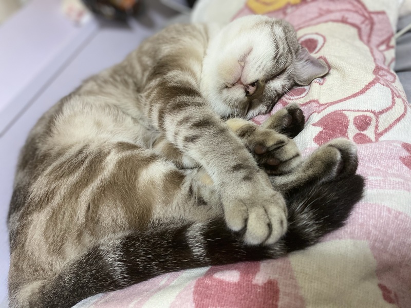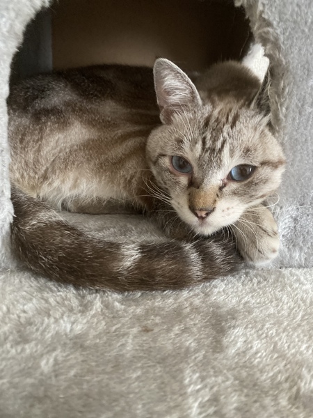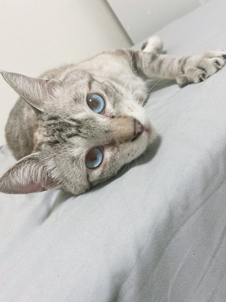 | 特徴(性格など) | シルバーに茶色の虎模様でとても変わった毛色でブルーの目をしているとても美形の猫です。 性格はビビりですが甘えん坊でどこにでもついてくるような人懐っこい猫です。 |