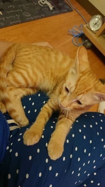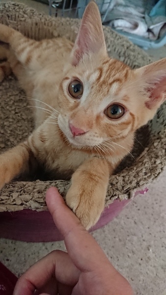 | 特徴(性格など) | 茶トラ 最初は少し人見知りしますが、すぐにスリゴロちゃんになります♡ トイレしつけバッチリ、なでなで大好きでお腹を見せてくれます。 遊ぶの大好きやんちゃっ子で、しっぽは真っ直ぐで細長いです。 懐くとずっと一緒に居たがるひっつき虫さんです。 1頭飼い、多頭飼いどちらも大丈夫です。 |