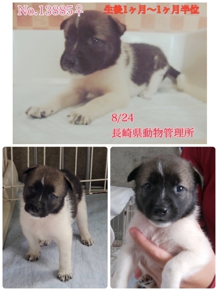 | 里親募集する理由 | まだ歯が生えたばかりのよちよち歩き、生後1ヶ月半位の可愛い雑種の仔犬、男の子と女の子の兄妹2匹です。 ♡No.13884 茶白君 ♡No.13885 白黒茶ちゃん 優しい職員さん方が大丈夫だよ、幸せになれます様にと毎日触れ合いながら一生懸命にお世話してくださっています。 現在は1日に3回、栄養価の高い良質な仔犬用のフードを粉末にしてミルクで溶いたものを与えています。 まだまだ幼く甘えたい盛り、長時間のお留守番は出来ません。夜泣きもします。 健康な成長の為に良質なフードを与える事が可能な方、育てる自信と覚悟のある方、出来れば飼育経験のある方が望ましいです m(_ _)m 当分の間はかなり手がかかり大変かと思いますがまだ仔犬ですし、人間が愛情をもって接すれば、この子達はきっと新しい初めての家庭環境にも馴染んでいけると思います。 広い心でドンとこい^_^と仰って頂ける方、愛くるしいこの子達をこの先もずーっと尻尾フリフリ♫ニコニコの笑顔にしてくださる方、いらっしゃいませんか? どうぞ宜しくお願い申し上げます(^^)! ⭐️必ず室内飼育で、譲渡後速やかに病院受診、健康診断、混合ワクチン、生後4〜6ヶ月頃を目処に去勢、避妊手術をする事が可能なご家庭。 ⭐️まだまだ幼い為長時間のお留守番は出来ません。なるべくお留守番の少ない、沢山優しくスキンシップやコミュニケーションで触れ合っていただけるご家庭。 ⭐️トイレの躾は1からとなります。まだ仔犬なので躾は入りやすいと思われます。現在ペットシートでトイレの練習中(^^) 最初は何かと手がかかり大変ですが(マナーベルトやペットシートを用意など)覚悟と根気・理解で受け入れて下さる方m(_ _)m ⭐️犬の飼育経験があり自信のある方、愛情を持って犬をしっかり躾することが出来る方、朝晩のお散歩や運動にも充分時間をあてられる方、場合によりトレーニング教室なども視野に入れて考えてくださる方。何卒宜しくお願い致します。 ⭐️親犬不明の為どの位の大きさになるか分かりません、大きくなっても、(今のところ吠えませんが)吠えても大丈夫なご家庭。 中型〜大きめの中型犬程度に成長すると思われますฅ•ﻌ•ฅ 以上の点を踏まえ、この子達が置かれている状況、寂しさをご理解の上、全て受け入れ寄り添っていただけるご家庭で可愛がって頂きたいと祈っております。 収容された全ての子達は身勝手な人間による被害者であり、何も悪くありません( ; ; ) 家族の一員として生涯大切にしてくださる優しいご家庭とのご縁が結ばれ幸せになれます様に♡ 家族の皆さんとずっと一緒に居られる温かいお家が見つかります様に☆⭐︎ 1日も早く温かな愛情を目一杯注がれながら、元気に幸せに生きてほしいです。人間より遙かに短い生涯です。 冷たく硬いコンクリートの上、狭い檻の中でひたすら優しい素敵な里親様を待ち続けています。 悲しい事にこの世の中、人間に飼われないと犬は生きていく事が出来ません。 捨てる飼い主、探さない飼い主、医療にかけない飼い主、虐待する飼い主…飼い主を選ぶ事も出来ません。 生まれたばかりのこれからのこの子達を、生涯大切に可愛がって下さる優しい素敵な里親様、どうかお願い致します。きっと、必ず唯一無二の最高の家族になります☆⭐︎ もうこれ以上悲しい辛い目に遭わせたくありません。 本当の愛情、温もりを知ってほしい、辛かった分、寂しかった分、まだまだこれからの犬生はのびのびと幸せいっぱいに愛し愛されて、生きてほしいと願っております。 家族の一員に迎え、愛ある温かなお家で、これからの生涯を共に暮らして頂けませんか。 何卒宜しくお願い致します(๑•ᴗ•๑)♡ https://dog.benesse.ne.jp/lovedog/content/?id=15698 ◆健康状態 今のところ元気にしていてご寄付で送って頂いた栄養価の高い良質なフードを粉末にしてミルクで溶いたものを1日3回食べています。 現在の体重は推定1キロ前後位ですฅ•ﻌ•ฅ ※管理所では収容するのみ、になり、健康診断やワクチン、治療などは一切行っておりません。 収容動物の健康面の保証、及びトライアル制度は無い為、例えどんな病があろうとも全てを受け止め丸ごと受け入れて下さる方、終生愛情飼養して下さる方のみ への譲渡となります事をご理解、ご了承の程何卒宜しくお願い申し上げますm(_ _)m ※譲渡後は必ず速やかに病院でメディカルチェック(血液検査、便検査、ノミダニ・フィラリア予防、シャンプー、混合ワクチン等)生後4か月〜半年頃を目処に不妊手術を確実にお願い致します。 ★去勢、避妊手術は長崎県動物管理所より譲渡条件の1つになりますが高齢、傷病犬であったり、何らかの疾患が見つかり治療が必要な場合には年齢・健康状態を考慮の上獣医師の判断を仰ぎ、ご報告を頂いております。 混合ワクチン接種も同様となります。 ★逸走、脱走にはくれぐれもご注意願いますm(_ _)m 交通事故等、命に関わります! 怖さからもがいて暴れて首輪、胴輪が抜けた子
