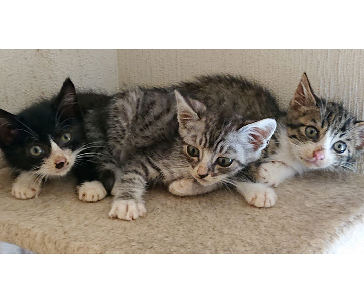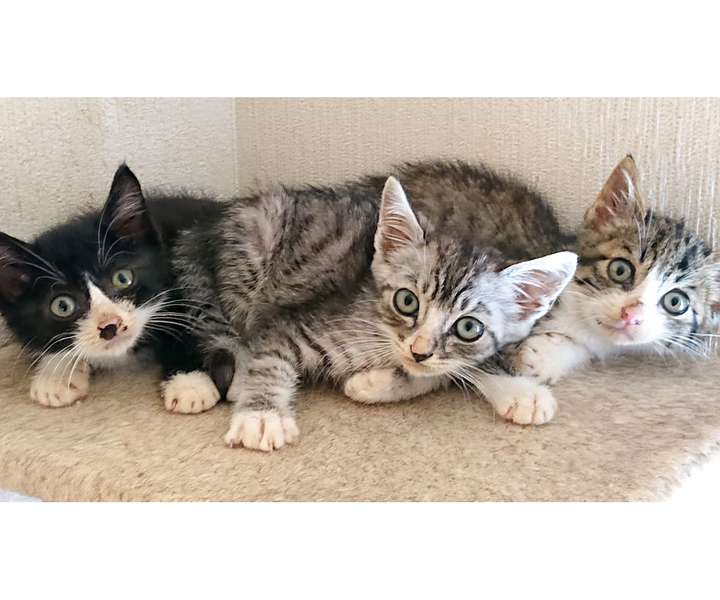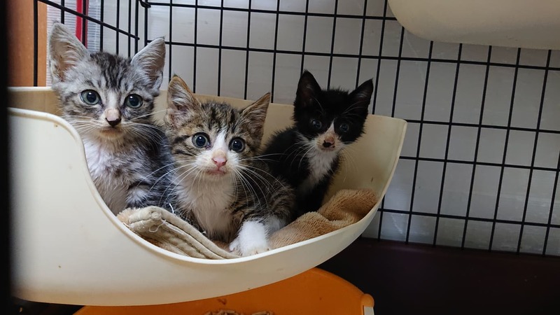 | 特徴(性格など) | キジ白、サバ白、黒白の3匹の仲良し兄弟です。 全員男の子です。 ワクチン1回済み、駆虫中 |