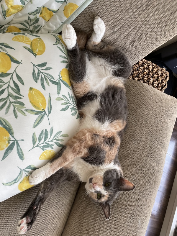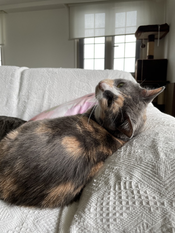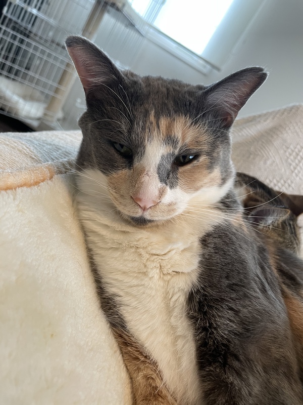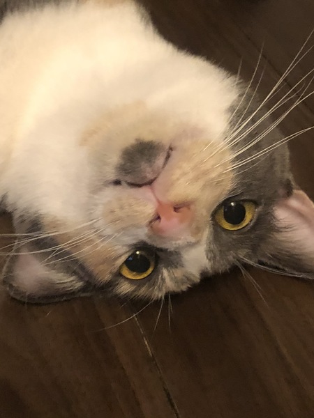 | 特徴(性格など) | 柄はミケスモーキー。 性格はどすこい娘? ギャル曽根並みに食べます笑 人にも他ニャンコにもフレンドリーです。猫様カニカマをとても愛し、カニカマ味の物には目がない娘です? |