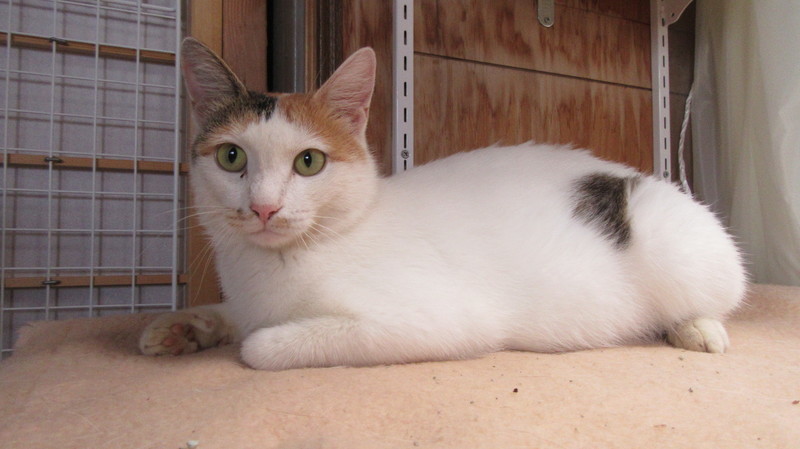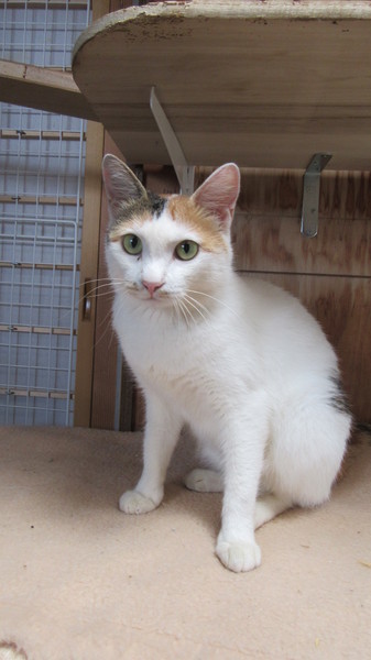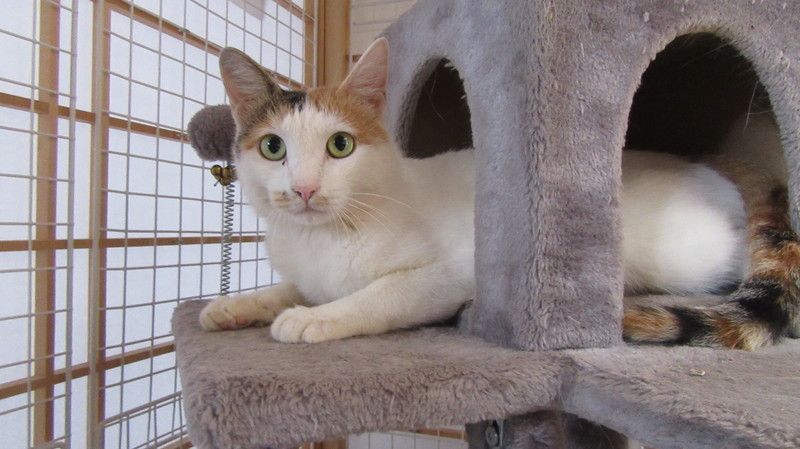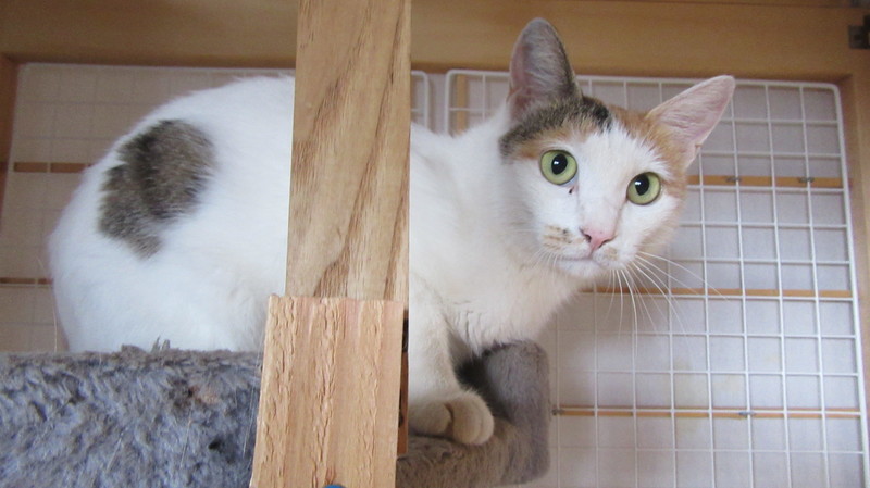 | 特徴(性格など) | 体は白で頭としっぽが三毛 保護時は人に対して警戒心が強かったですが、今は懐いてくれて撫でられるとゴロゴロ鳴くまでになりました。甘噛み上手、甘え上手です。 ただ狭いケージが苦手なので、今は1匹だけ特別な広い部屋で生活しています。 |