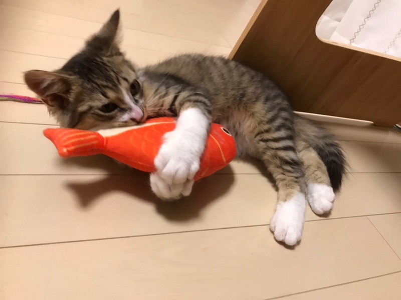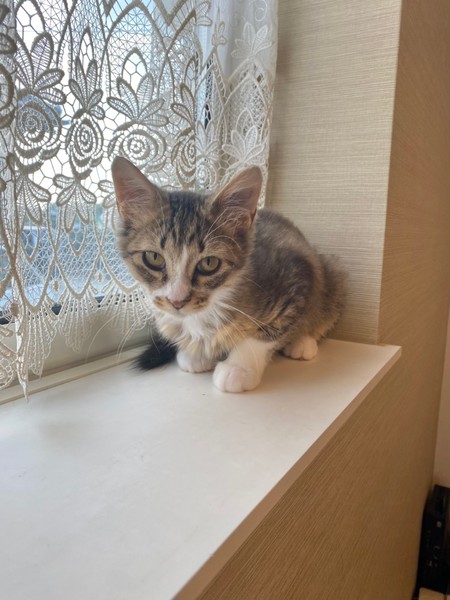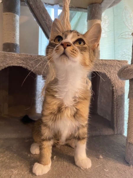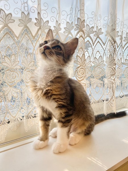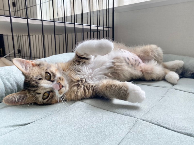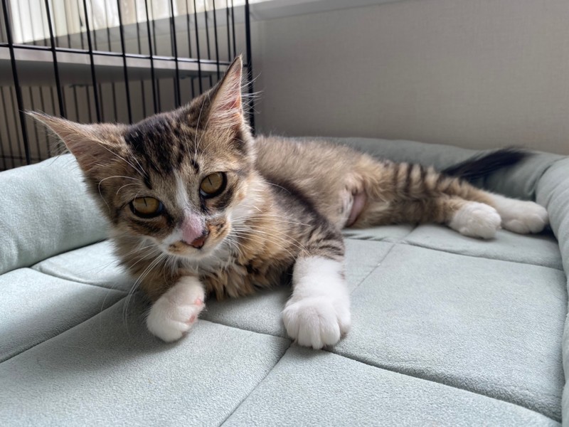 | 特徴(性格など) | 2021.5.30生まれ(推定) 毛色:キジ白長毛 高熱を出し、体に怪我をしていて動けなくなっていた所、保護された女の子。 柔らかい長毛で、長さ違いのおて手ソックスがチャームポイント☆ 人が大好きで擦り寄ってゴロゴロしてくれます♡ お魚のぬいぐるみのおもちゃがお気に入り。 お友達との追いかけっこも大好きです♪ |