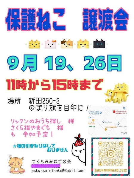 | その他(譲渡条件など) | 【猫の里親を希望される方は、以下の譲渡条件のご確認をお願いいたします】 ●終生、責任と愛情を持って、大事な家族として育てて頂けるようお願いします。 ●一戸建て住宅またはペット可物件にて、完全室内飼育でお願いします。 ●猫を迎えることにご家族全員の承諾をお願いします。 ●お引き取り後はワクチン、ノミダニ駆除、避妊など、定期的に医療ケアをお願いします。 ●譲渡後も無理のない範囲でかまいませんので、成長の様子をご連絡頂きますようお願いします。 ●引き渡しの際に身分証明などを提示し、誓約書への署名をお願いします。 ●トライアルはご自宅にお連れしますので、往復の交通費のご負担をお願いします。 ●高齢者・単身者世帯の方は、60歳以下の後見人が必要となりますので、先に後見人さんの了解を得てからのご応募をお願いします。 ●初めて猫を飼う方は、ご家族に猫アレルギーがないかご確認ください。 |