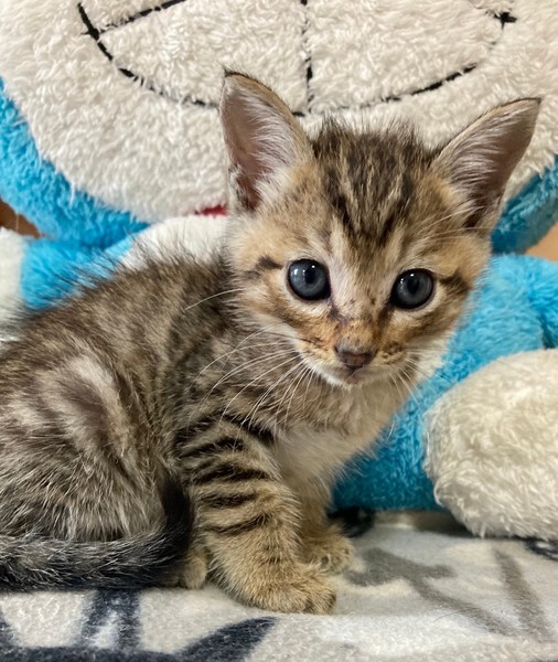 | 特徴(性格など) | ポニョちゃん(メス)と一緒に生まれたばかりの状態で保護されました。やっと現在430グラムになり、兄妹で元気に過ごしています(^^) 性格は甘えたでおしゃべり好き。ご飯もよく食べ活発な子です。他の猫ちゃんやワンちゃんとも仲良くできています。 兄妹一緒に飼っていただける方が希望です。よろしくお願いいたします。 ノミダニ駆除のみ済 ワクチン、エイズ白血病検査は月齢が小さいため未接種です。(予定) |