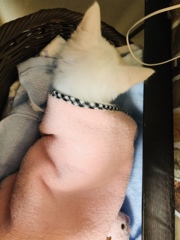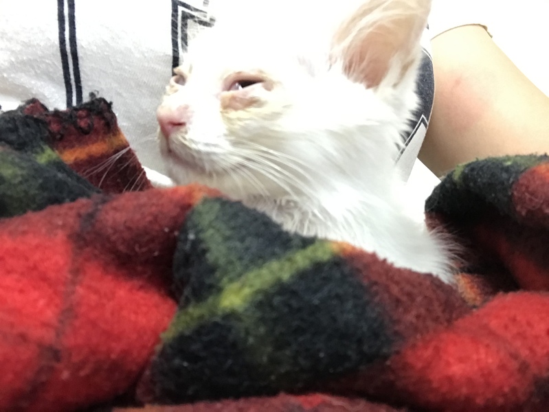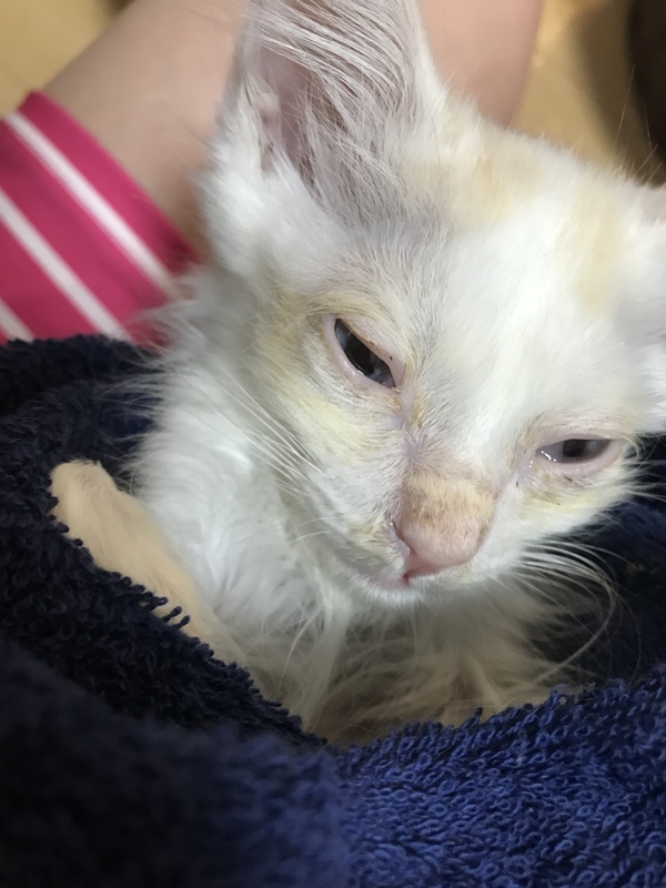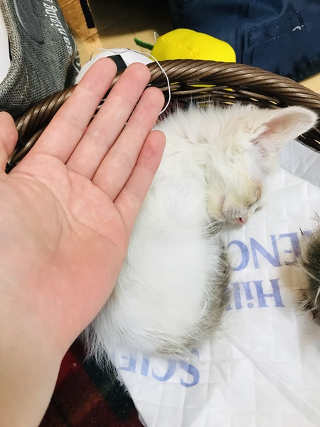 | 特徴(性格など) | 8.31に野良猫の状態で保護したため今現在は風邪の治療中です。(ノミシラミ駆除済み)当日すぐに病院へ連れていき診てもらったところ猫風邪をひいているとのことで、薬を飲ませ目薬をさしています。とても元気がよく、食欲も旺盛で体重は660gでしたが保護した時から少しずつ増えている様子です。ただ目の周りの汚れをふていもなかなか綺麗にとれず、目薬で様子見です。くしゃみ鼻水は落ち着きましたが一週間後にまた病院に連れていきます。親猫不明、また生後1か月半までどのような状態だったか不明のため病気の有無がわかりません。猫風邪のためヘルペスウイルスは持っているだろうと獣医さんには言われました。猫エイズや白血病の検査はまだ小さいためできないそうで、1~2か月待たないと検査ができないと言われました。目立った外傷、怪我はなく食欲旺盛でうんちも尿もちゃんとできているので、今のところ問題があるようには見えません。とはいえウイルスや病気に関して不明の状態ですので仮に病気を抱えていたとしても飼うことができる、という方のみご連絡ください。(先住猫に病気をうつされるのが怖いという方は現時点では辞退していただいたほうがよいかもしれません。)今すぐにアパートから手放さないといけないため、すぐに引き取ってくださる方歓迎ですm(_ _)m | ||