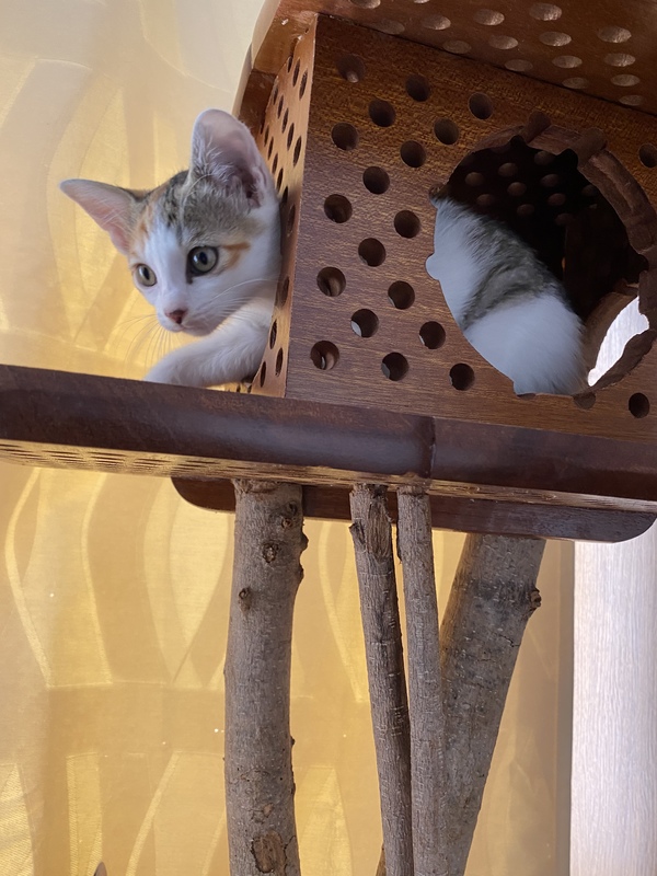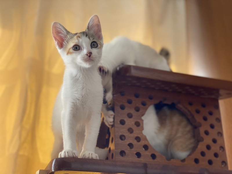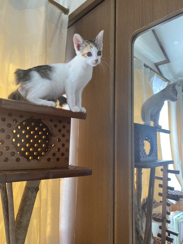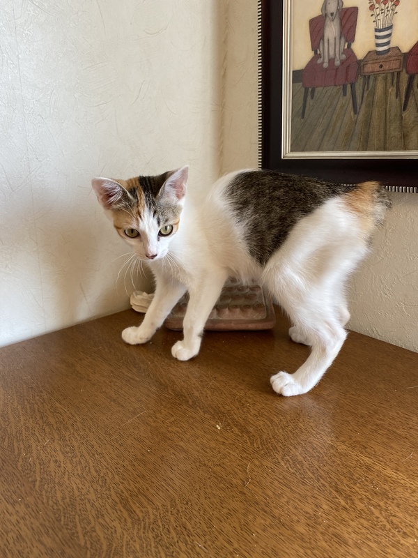 | 特徴(性格など) | ボブテイルの三毛猫の女の子です。 兄弟の中で一匹だけ女の子でした。 母猫に甘えたり、兄弟猫や他の猫と楽しく遊んでいます。人にも馴れています。 |