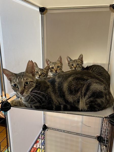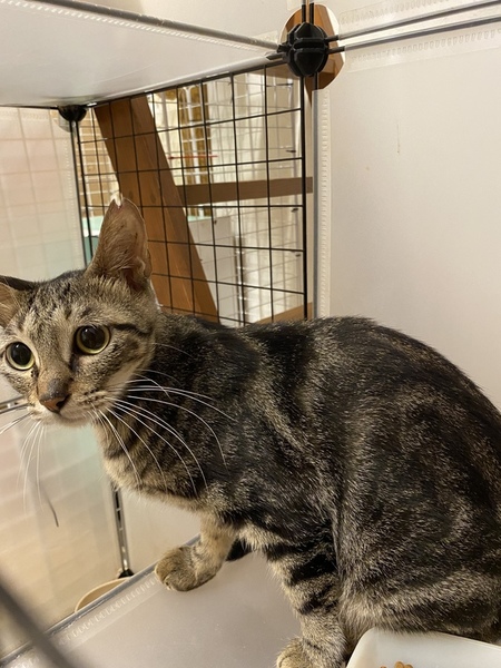 | 特徴(性格など) | アメショーのような渦巻みたいで濃い色の柄の女の子です。 赤ちゃんと一緒に保護されましたので、今は赤ちゃんに母乳をあげたり、くっついて眠ったりしています。 こちらに来て日が浅いので、まだ警戒中ですが、性格はおとなしい方だと思います。 |