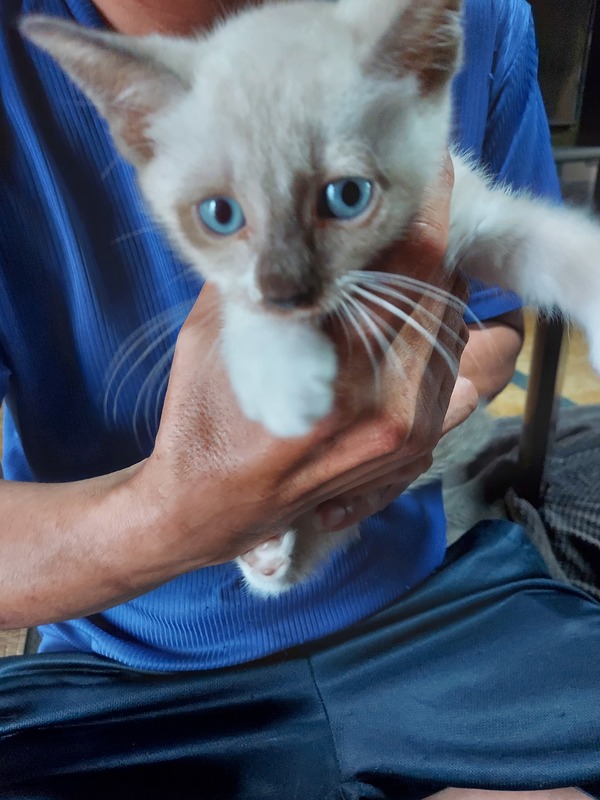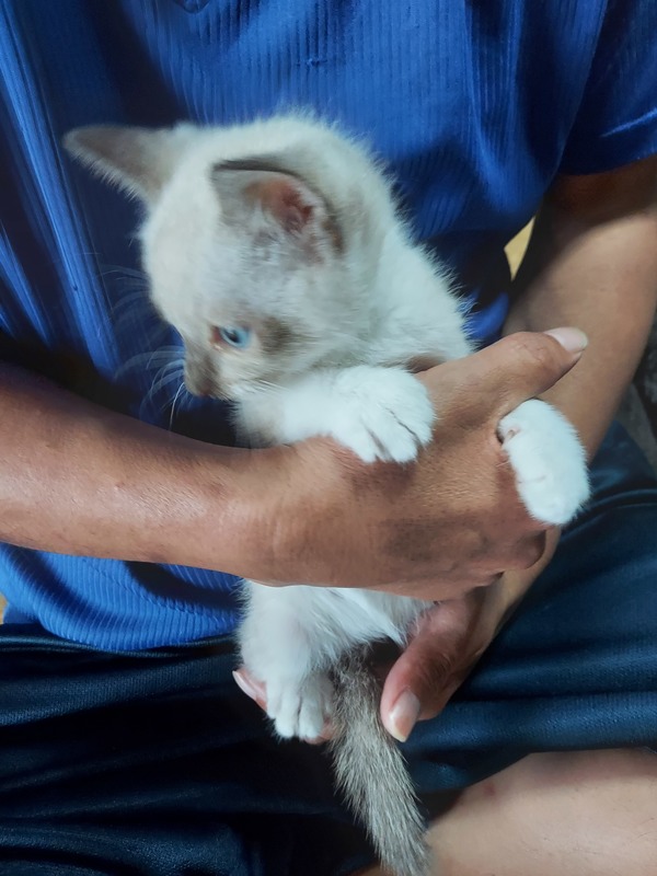| 特徴(性格など) | 全体的に白色ですが、しっぽが少し黒味がかかっていて目の周りが黒っぽい感じになります。 瞳がブルーで、もしかしたらシャムとのハーフかもしれません。 性格は、ちょっと怖がりですが今は元気いっぱいで走り回っています。 |