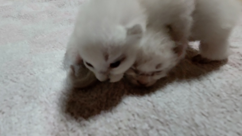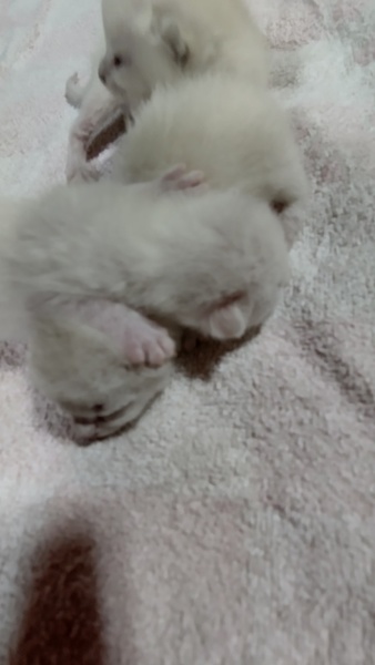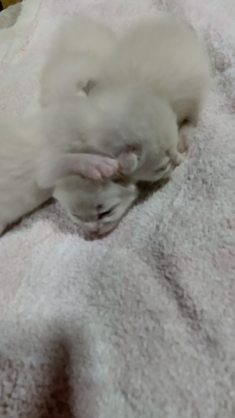 | 特徴(性格など) | 産まれたてで今は真っ白です。1匹は耳の先が黒っぽい。 成長するとたぶん、シャム柄になると思います。産まれたての子は全てメスです |
