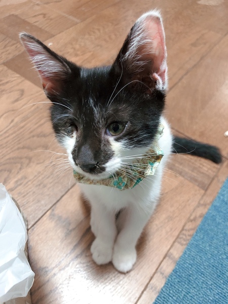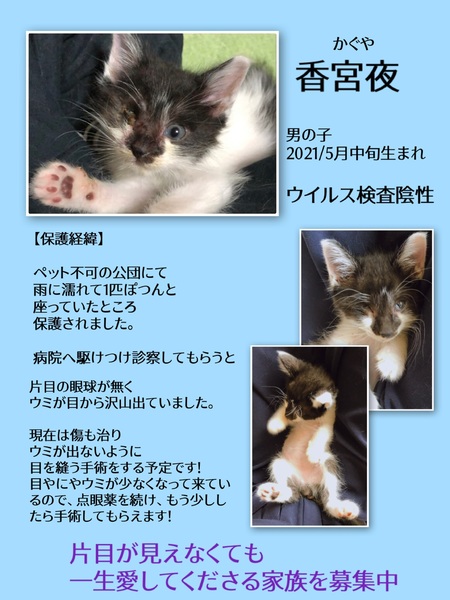 | 里親募集する理由 | 1か月半ごろの時に保護しました。保護当時から片目が無く顔は怪我をしていたので、鳥か野生動物に片目(眼球)を取られてしまったのだと思います。病院に通い治療し、今では元気になりました。 | ||