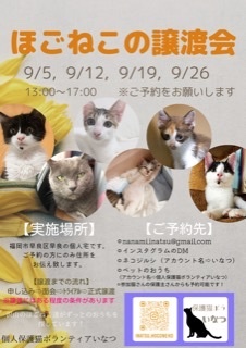 | その他(譲渡条件など) | 諸条件ありますが、 夫婦、ご家族、単身者やご高齢でも後見人様を必ず用意していただきますのでご了承ください。 面会日または、毎週日曜日に譲渡会を開催していますので、ご予約の上面会に来ていただきます。 |