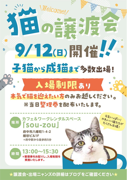 | その他(譲渡条件など) | \/\/\/\/\/\/\/\/\/\/\/\/\/\/\/\/\/\/\/\/ 元野良猫出身や多頭崩壊出身の子達ばかりが出場します。 保護当初はそれはもう痩せ細り、貧弱な子達ばかりでした。 でも、にゃんず達はがんばりました。 頑張って治療にも耐え、健康な体を手に入れ、そして家猫訓練もがんばってきた子達が、 やっとやっとの思いで譲渡会に出場します! 医療処置は出来る限りの範囲で妥協せずに行っております。 人に甘えるのがまだまだ不器用な子達もたくさんおります。 そこをご理解いただき、ぜひ!かわいいかわいいちゅー猫達をご家族にお迎えください。 よろしくお願い申し上げます。 \/\/\/\/\/\/\/\/\/\/\/\/\/\/\/\/\/\/\/\/ 〓〓〓〓〓〓〓〓〓〓譲渡会案内〓〓〓〓〓〓〓〓〓〓〓〓〓〓 ♠︎令和3年 9月12日(日) ♠︎13時〜15時30分まで ♠︎会場は【カフェ&ワークスペース sou-zou】 ・京王線【府中駅】から徒歩5分 ・駐車場はございません。 ・お車でお越しの方は最寄りのパーキングにお願いします。 ・自転車を止めるスペースがございません。 ※会場へ直接のお問い合わせは、ご遠慮ください。 fuchu_nekonokai@yahoo.co.jpまで。 【カフェ&ワークスペース sou-zou】 http://sou-zou.jp/ 〓〓〓〓〓〓〓〓〓〓〓〓〓〓〓〓〓〓〓〓〓〓〓〓〓〓〓〓〓 ▼譲渡会にお越し頂いた方を優先に譲渡したいと考えております。 ▼完全予約制ではありませんが、会場内の密を避ける為に、整理券を配布して入場制限をさせていただいきます。 ※予約制ではないので、時間内(13時〜15時30分まで)にお越しください。 (コロナ感染防止の為、一組様30分制限とさせていただきます) ▼大変申し訳ございませんが、ご見学はお断りさせていただきます。 コロナ対策で密を避ける為にも、かなり徹底した入場制限をいたします。 本気で猫ちゃんを迎えたい方々のみのご来場をよろしくお願い申し上げます。 ▼ご支援物資なども今回は申し訳ありませんが受け付けておりません。 お気持ちだけありがたくご頂戴いたします。 ▼特に、お子様のいるご家庭は猫アレルギーの有無をご明確にしていただくと選考しやすいです。 初めて猫ちゃんを迎える方はアレルギー検査をオススメしております。 ▼単身者の方は後継人が必要となります。お子さんがいらっしゃるご家庭で、初めて猫ちゃんを迎える方は、必ずアレルギー検査をした上でお越しください。詳しくは下記にあるURLを必ずお読みください。 ▼譲渡会に参加予定の方は、必ずこちらをご参照ください。 ↓ ↓ ↓ ↓ ↓ ↓ https://ameblo.jp/team-rose-cats/entry-12174516271.html ▼26匹参加予定! 詳しくは一匹づつのブログ記事の情報をご参考下さい。 (※参加にゃんずの情報を、いち早く知りたい方は、YouTubeの『ちゅー猫チャンネル』をご覧になられると保護猫達の様子がわかります!) 『ちゅー猫チャンネル』 ↓ ↓ ↓ ↓ https://youtube.com/channel/UC4YseOceX9CQfZtgXTg83sw ▼△▼△▼応募条件▼△▼△▼ ・ペット可の住宅。 ・完全室内飼い(脱走防止に配慮いただける方) ・定期的な健康check(必要な医療処置を含む) ・終生飼育(ご高齢または単身の方は、後見人相当の方のご同意をお願いします) ・ワクチン、去勢避妊の医療費(証明書類を提示またはお渡しします)を負担いただける方 ※リクエストに応じ環境に慣れるまでの間、ケージを無償レンタルすることも可能です(数に限りがあるので、その点ご承知ください) ▼応募可能地域 埼玉県南東部、東京都、神奈川県北東部. 移動による猫の負担を考慮し、調布飛行場から40km圏内にお住まいの方 詳しくは譲渡会場にてお尋ね下さい。 ※対応をスムーズに行うため、飼育経験,ご家族構成,応募の動機など、簡単なアンケート(当日配布)にご協 力ください ※当日の引渡しではなく、後日ご自宅へお届けとなります ※当日ご来場不可の方は、message機能または、mailでお問合せ下さい。 ▼譲渡会の流れ https://ameblo.jp/team-rose-cats/entry-12174516271.html |