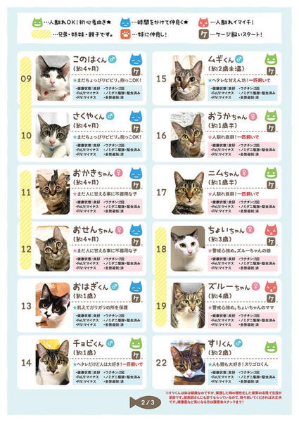 | その他(譲渡条件など) | \/\/\/\/\/\/\/\/\/\/\/\/\/\/\/\/\/\/\/\/ 元野良猫出身や多頭崩壊出身の子達ばかりが出場します。 保護当初はそれはもう痩せ細り、貧弱な子達ばかりでした。 でも、にゃんず達はがんばりました。 頑張って治療にも耐え、健康な体を手に入れ、そして家猫訓練もがんばってきた子達が、 やっとやっとの思いで譲渡会に出場します! 医療処置は出来る限りの範囲で妥協せずに行っております。 人に甘えるのがまだまだ不器用な子達もたくさんおります。 そこをご理解いただき、ぜひ!かわいいかわいいちゅー猫達をご家族にお迎えください。 よろしくお願い申し上げます。 \/\/\/\/\/\/\/\/\/\/\/\/\/\/\/\/\/\/\/\/ 〓〓〓〓〓〓〓〓〓〓譲渡会案内〓〓〓〓〓〓〓〓〓〓〓〓〓〓 ♠︎令和3年 9月12日(日) ♠︎13時〜15時30分まで ♠︎会場は【カフェ&ワークスペース sou-zou】 ・京王線【府中駅】から徒歩5分 ・駐車場はございません。 ・お車でお越しの方は最寄りのパーキングにお願いします。 ・自転車を止めるスペースがございません。 ※会場へ直接のお問い合わせは、ご遠慮ください。 fuchu_nekonokai@yahoo.co.jpまで。 【カフェ&ワークスペース sou-zou】 http://sou-zou.jp/ 〓〓〓〓〓〓〓〓〓〓〓〓〓〓〓〓〓〓〓〓〓〓〓〓〓〓〓〓〓 ▼譲渡会にお越し頂いた方を優先に譲渡したいと考えております。 ▼完全予約制ではありませんが、会場内の密を避ける為に、整理券を配布して入場制限をさせていただいきます。 ※予約制ではないので、時間内(13時〜15時30分まで)にお越しください。 (コロナ感染防止の為、一組様30分制限とさせていただきます) ▼大変申し訳ございませんが、ご見学はお断りさせていただきます。 コロナ対策で密を避ける為にも、かなり徹底した入場制限をいたします。 本気で猫ちゃんを迎えたい方々のみのご来場をよろしくお願い申し上げます。 ▼ご支援物資なども今回は申し訳ありませんが受け付けておりません。 お気持ちだけありがたくご頂戴いたします。 ▼特に、お子様のいるご家庭は猫アレルギーの有無をご明確にしていただくと選考しやすいです。 初めて猫ちゃんを迎える方はアレルギー検査をオススメしております。 ▼単身者の方は後継人が必要となります。お子さんがいらっしゃるご家庭で、初めて猫ちゃんを迎える方は、必ずアレルギー検査をした上でお越しください。詳しくは下記にあるURLを必ずお読みください。 ▼譲渡会に参加予定の方は、必ずこちらをご参照ください。 ↓ ↓ ↓ ↓ ↓ ↓ https://ameblo.jp/team-rose-cats/entry-12174516271.html ▼26匹参加予定! 詳しくは一匹づつのブログ記事の情報をご参考下さい。 (※参加にゃんずの情報を、いち早く知りたい方は、YouTubeの『ちゅー猫チャンネル』をご覧になられると保護猫達の様子がわかります!) 『ちゅー猫チャンネル』 ↓ ↓ ↓ ↓ https://youtube.com/channel/UC4YseOceX9CQfZtgXTg83sw ▼△▼△▼応募条件▼△▼△▼ ・ペット可の住宅。 ・完全室内飼い(脱走防止に配慮いただける方) ・定期的な健康check(必要な医療処置を含む) ・終生飼育(ご高齢または単身の方は、後見人相当の方のご同意をお願いします) ・ワクチン、去勢避妊の医療費(証明書類を提示またはお渡しします)を負担いただける方 ※リクエストに応じ環境に慣れるまでの間、ケージを無償レンタルすることも可能です(数に限りがあるので、その点ご承知ください) ▼応募可能地域 埼玉県南東部、東京都、神奈川県北東部. 移動による猫の負担を考慮し、調布飛行場から40km圏内にお住まいの方 詳しくは譲渡会場にてお尋ね下さい。 ※対応をスムーズに行うため、飼育経験,ご家族構成,応募の動機など、簡単なアンケート(当日配布)にご協 力ください ※当日の引渡しではなく、後日ご自宅へお届けとなります ※当日ご来場不可の方は、message機能または、mailでお問合せ下さい。 ▼譲渡会の流れ https://ameblo.jp/team-rose-cats/entry-12174516271.html |