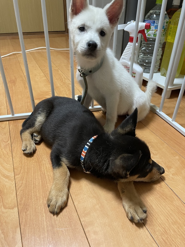 | 特徴(性格など) | とても元気でおもちゃでたくさん遊んでいます。 人も大好きです。 綺麗な白毛です。 柴犬、紀州犬の難しいところが少しずつでています。 |