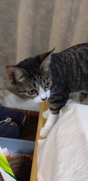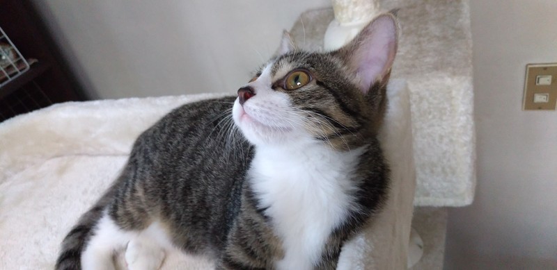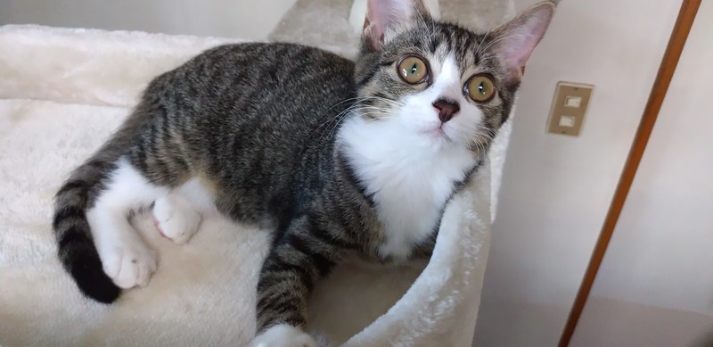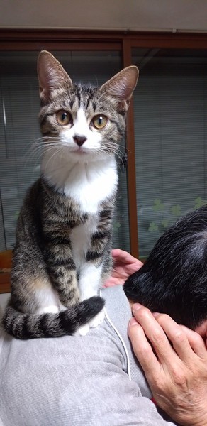 | 特徴(性格など) | キジ白 長尻尾 白いあんよに黒いポチポチがあります 人馴れ◎ 猫慣れ◎ 好奇心旺盛な女の子ですが、そそっかしい所もあって 足を踏み外して探検中のテーブルの上からずり落ちることも・・・。 保護時酷い猫風邪をひいていて治療を受けたのですが鼻炎が残ってしまいました。 (いつもクシャミや鼻水が出ているわけではありません) 現在本猫はいたって元気で食欲もあり普通の仔猫生活を送ってます。 (頻繫にクシャミをしたり熱がある場合は受診治療をお願い致します。) |