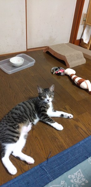 | 里親募集する理由 | 兄妹達と段ボール箱に入れられ(ふたは開いていましたが)用水路に遺棄されているのを発見・保護しました。 我が家は高齢者世帯のため、この子達を終生飼養するのは困難と考え、里親様を募集する事に致しました。 (他の兄妹は既に優しい里親様の下で暮らしております) |