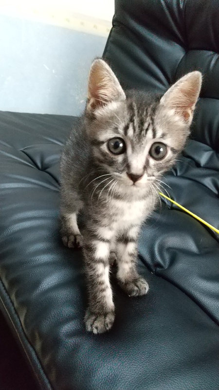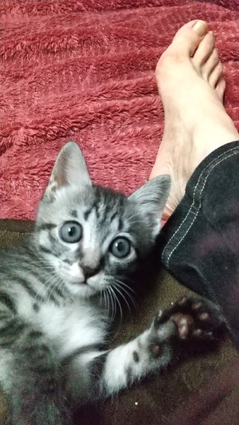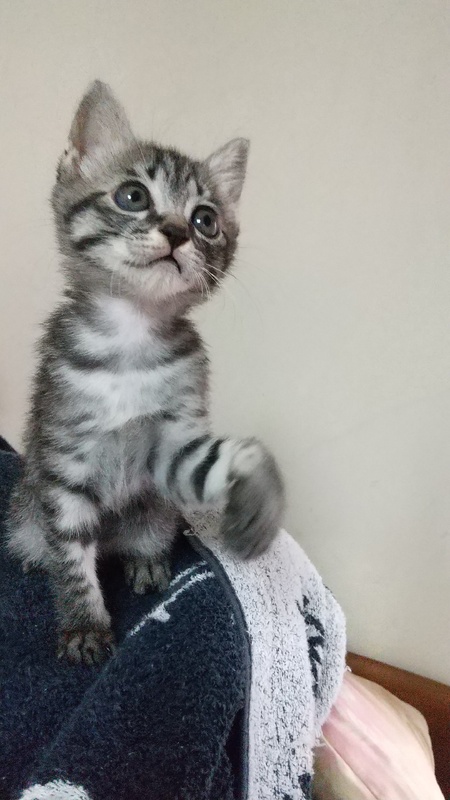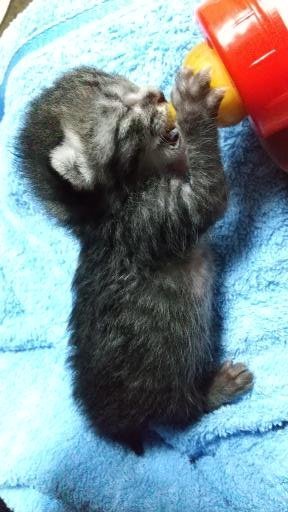 | 特徴(性格など) | とにかく元気で慎重でツンデレな猫らしい性格です。 まだ2か月にもなっていないのに飛びます。 へその緒がついているときから人間に育てられ、人なれ場所なれをしていると思います。 はじめはネズミに浅利が引っ付いているみたいな姿でしたが、どんどんかわいくなり毛色も 日に日に柄がはっきりしてきています。 最近少しグレーがかってきました。 ミルクのときから形のあるウンチをして、病院で褒められる胃腸の丈夫な仔です。 |