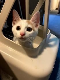 | 特徴(性格など) | 白に茶色の模様。活発な男の子。猫エイズ、猫白血病、ともに陰性。 | ||