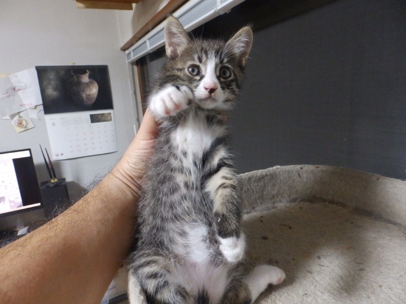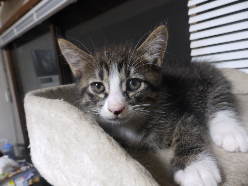 | 特徴(性格など) | キジトラで白ソックスがアクセントの女の子です。三姉妹の長女で妹たちよりも若干大きいです。元気に家中を駆け回っています。トイレトレーニング完了。餌はカリカリもパウチもモリモリ食べます。 | ||