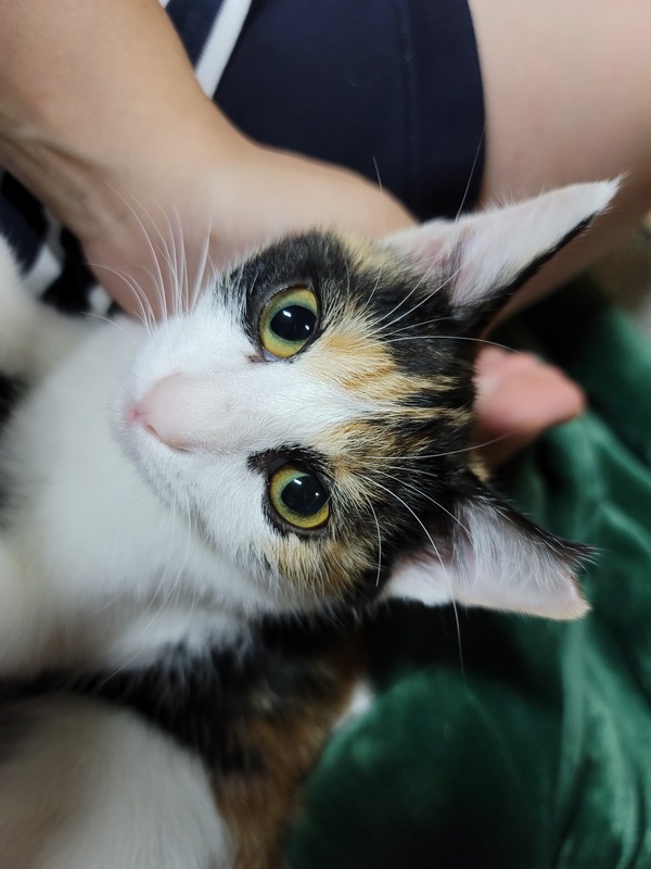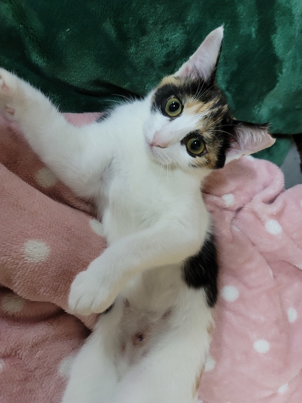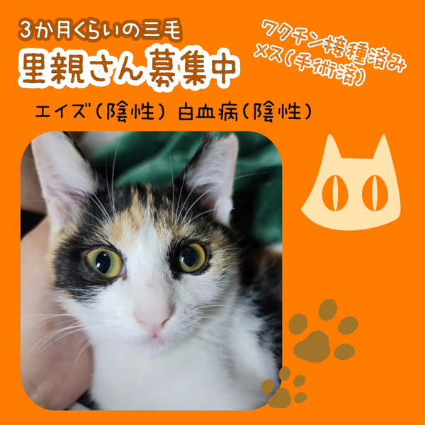 | 特徴(性格など) | 三毛猫の女の子です。 現在、少しづつ人に対して心を開いてきている元野良猫さんの子どもです。 元気いっぱいでよくじゃれて遊んでいます。 触ろうとすると逃げたりすることはありますがご飯の時などは人間の傍に寄って来てご飯を催促します。 同居の小型犬とは仲良くできてます。 ★さくら耳カットあり ★不妊手術済 ★ワクチン済(3種) ★猫白血病(-)/猫エイズ(-) ★検便は後日実施予定 |