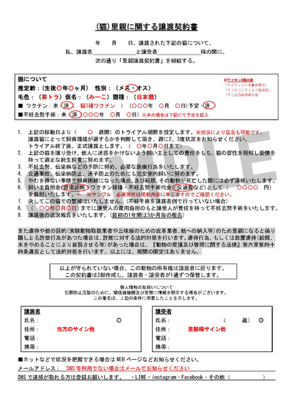| 譲渡費用(医療費、交通費など) | 追記修正:20210914 ■譲渡費用 血液検査費用(猫白血病・猫エイズ):3850円(税込) 検便検査(後日実施)実費にてお支払いください。 先住猫さんが居る場合は検査後(-)確認後トライアル予定。 大阪・和歌山周辺の場合は交通費は不要 ※その他の地域は要相談(当方、大阪府泉佐野市) TNR活動の一環で保護に至りましたので 不妊手術費および、ワクチン接種の費用は頂いておりません。 【SAMPLE】画像にも添付してますのでご確認ください。 1. 上記の移動日より( 2週間程度)のトライアル期間を設定します。 譲渡猫にとって飼育環境が適するかを判断して頂き、週に2、3度状況をお知らせください。 トライアル終了後、正式譲渡とします。 2. 上記の猫を譲り受け、他人に迷惑をかけないよう飼い主としての責任をもち、猫の習性を理解し愛情を持って適正な終生飼養に努めます。 3. 不妊去勢、伝染病などの予防に努め、必要な医療行為をいたします。 4. 交通事故、伝染病防止、迷子防止のためにも完全室内飼いに努めます。 5. やむを得ない事情で飼育困難になった場合、及び転居、その動物が死亡した際には必ず連絡いたします 。 6. 飼い主負担金(健康診断・ワクチン接種・不妊去勢手術代金・交通費など)として( ※ 円)を負担いたします。 7. 決してこの猫での繁殖はいたしません。(不妊手術を譲渡者側で行っていない場合) 8. ( ※ 年 月 日)までに譲受人の費用負担のもと譲受人が責任を持って不妊去勢手術をいたします。 9. 譲渡後の近況報告をいたします。(最初の1年間は3か月毎の報告) ※は交渉時に記載させて頂きます。 |