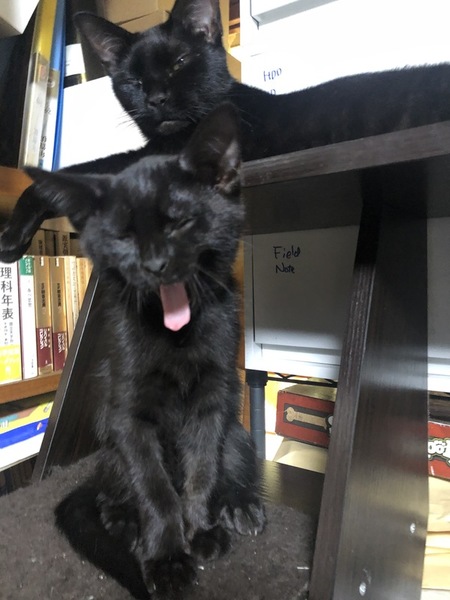 | 特徴(性格など) | 黒猫二匹です。母猫(2枚目の写真の後ろに寝ぼけ顔で写っています)と我が家で元気に育ってます。トイレも覚え、時々おっぱい飲んでいますが食事も普通に猫缶とドライフードを食べるようになりました。先住猫とも元気に遊び、餌の時間にはまっさきに集まってます。性格はどちらも活発な感じで、毛色ともよく似ていて一緒に寝ていると(一枚目の写真)私も見分けがつきません。 | ||