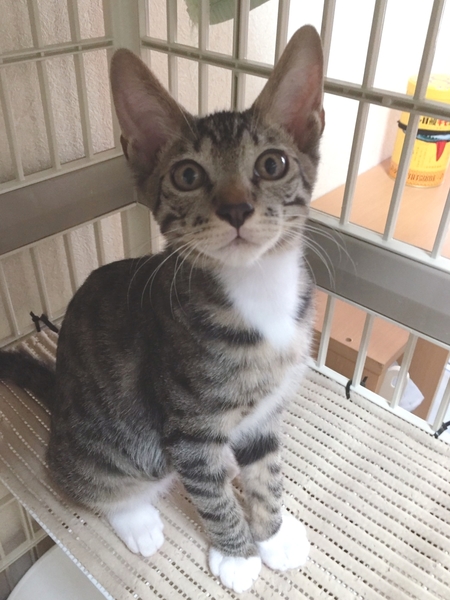 | 特徴(性格など) | 2021.5.17生まれ(推定) 毛色:キジ白 白ソックスに長いシッポ、キジトラと思いきや、 背中中央に黒い線があり両脇がヒョウ柄。 元気溌剌、遊ぶの大好きです。 張り切り過ぎて、おもちゃを独り占めすることも…。 撫でるとゴロゴロ、でも他の猫の遊んでる音が聞こえると、 そちらに飛んでいきます。 先住猫さんがいるお家でも、慣れるとグイグイ、物怖じしない積極的なタイプです。 |