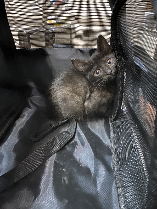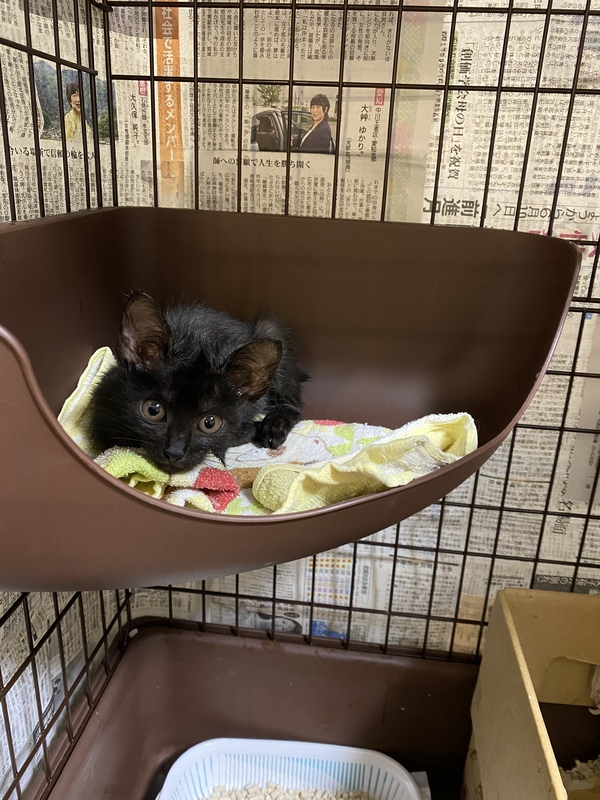 | 特徴(性格など) | しっぽの短い黒猫ちゃんです。 小柄で大人しいですが人を怖がらず、穏やかな顔立ちです。 いつも一緒に保護した赤トラくんと寄り添って寝る寂しがり屋なところがありそうです。 |