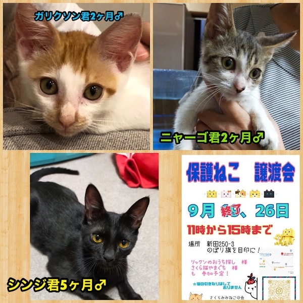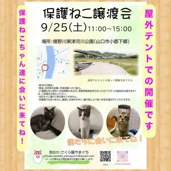 | その他(譲渡条件など) | 9月25日(土)山口市椹野川東津河川公園で開催される譲渡会と、9月26日(日)防府市新田250-3で開催される『保護ねこ譲渡会』に参加予定です。 時間は11時から15時まで。春から夏に産まれた仔猫がたくさん参加します。可愛い子に会いに来てくださいね。 *現在の感染状況を鑑み、ご参加は山口県内の方に限らせて頂きたいと思いますので、ご理解お願い致します。県外の方は個別お見合いに対応します。 【猫の里親を希望される方は、以下の譲渡条件のご確認をお願いいたします】 ●終生、責任と愛情を持って、大事な家族として育てて頂けるようお願いします。 ●一戸建て住宅またはペット可物件にて、完全室内飼育でお願いします。 ●猫を迎えることにご家族全員の承諾をお願いします。 ●お引き取り後はワクチン、ノミダニ駆除、去勢など、定期的に医療ケアをお願いします。 ●譲渡後も無理のない範囲でかまいませんので、成長の様子をご連絡頂きますようお願いします。 ●引き渡しの際に身分証明などを提示し、誓約書への署名をお願いします。 ●お連れするときに往復の交通費のご負担をお願いします。 ●高齢者・単身者世帯の方は、60歳以下の後見人が必要となりますので、先に後見人さんの了解を得てからのご応募をお願いします。 ●初めて猫を飼う方は、ご家族に猫アレルギーがないかご確認ください。 ●初期医療費としてノミダニ駆除費用2000円をご負担お願い致します。 |