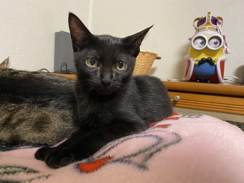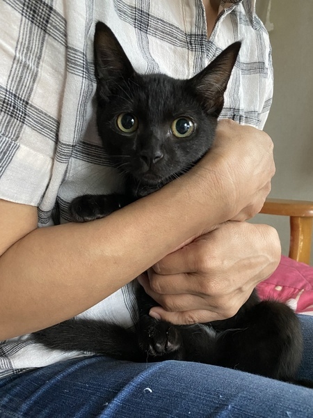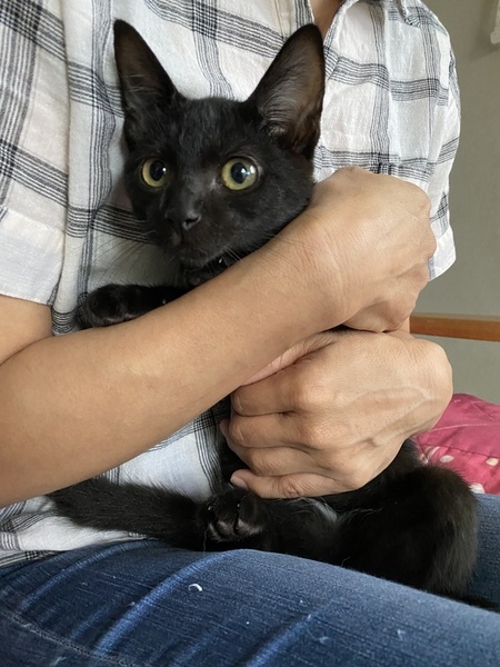 | 特徴(性格など) | 最初は警戒心がありましたが保護6日目〜慣れてくるようになりました。今ではすごく甘えん坊です。抱っこも出来ます。猫じゃらしやボールを追いかけて遊んだり、とても元気な子です! 耳の中から生えている白い毛と、お腹に少しだけ生えている白い毛がとっても可愛くて特徴的です。(写真6枚目に乗せています) 初めて会う私にも逃げずに捕獲器を使わないで手で捕獲できたくらいなので、警戒心がないと思いました。 子猫なので新たなお家でもすぐ順応すると思います。 |