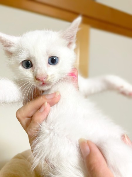 | 特徴(性格など) | オッドアイのメス白猫です。 白猫メス2匹、黒猫オス、メス2匹で保護しました。 グレーとブルーの瞳をしています。 少し写真では分かりにくいかもしれませんが・・ まだ月齢も小さく性格はわかりませんが、兄妹仲良く遊んでいます。 ☆白猫、黒猫ちゃんペアで飼っていただける方を探してます オセロみたいで可愛いですよ♪ 健康状態 元気にしています。 ・ノミダニ回虫駆除駆除 ・エイズ、白血病検査 未検査 ・3種混合ワクチン 未接種 |