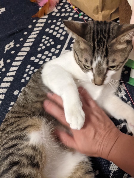 | 特徴(性格など) | ◆ライくん びびりから膝乗り猫に変身したキジ白男子 ○生後間もなく千葉県内で保護され里子にいきましたが、飼い主さんの健康上の理由で飼育困難となり、新しい家族を探しています。 ○推定1歳5ヶ月(2021年9月時点。2020年4月生まれとのことです)のキジ白の男の子です。体重は4.5kgです。 ○鼻に柄があるところがチャームポイントです。 ○尻尾は長く鞭のようにしなやかです。 ○「ライ君!」と呼ぶと「ぴゃーっ」と高い声で返事をしてくれます。 ○びびりですが、2週間程度で触らせてくれるようになり、1ヶ月少しで膝に乗ってくれるくらいになりました。 ○馴れてくると、足元に体を擦り寄せて来ます。 ○抱っこはあまり得意ではないようです。 ○他の猫ともうまくやっていけます。(シャーと言われてもめげずに近寄ります。) ○運動能力が高く、子猫用に作った高さ1m くらいの柵もなんなく飛び越えます。脱走防止策は確実にお願いしたいです。 ○遊びが好きですし、好奇心旺盛で買い物袋を置きっぱなしにするとすぐに頭をつっこみます。 ○おやつの煮干しが大好物です。 ★ワクチン2回済み(昨年分。今年はこれから)、不妊手術済み。 ★猫エイズ、猫白血病ともに陰性。 ○YouTubeにも動画をあげています。こちらもご覧下さい。 その1 https://youtu.be/bfyMl3VM3Qw その2 https://youtu.be/erttd4XlkQA その3 https://youtu.be/iDMeJdWr5EE その4 https://youtu.be/wtIysphWFUQ ☆単身のかたはご相談ください。 ○10/2(土)開催の譲渡会に参加予定! 以下の要項をお読みいただき、ぜひ会いに来てください♪ ☆★☆★☆★☆★☆★☆★☆★☆★☆★☆★☆★☆★☆★☆★☆★☆★☆★☆★☆ ~10月2日(土)市ヶ尾にて譲渡会開催!~ ◎場所・・「東急ドエル市ヶ尾プラーザビル2階集会場」 神奈川県横浜市青葉区市ヶ尾町1154-2 田園都市線「市ヶ尾」駅西口より徒歩約2分 ◎日程・・10月2日(土)(雨天決行) ◎時間・・13時から16時(受付は15時30分まで) (会場に利用可能な駐車場はございません。近隣のコインパーキングをご利用ください。) *3密対策のため、当日12時30分より会場にて全時間分の整理券を配布いたします。整理券枚数には限りがございますので、上限に達した場合はご入場できません。 *参加の際は、マスクの着用、アルコール消毒のご協力をお願いいたします。 *当日は検温の上、体温が37度以上の方はご参加いただけません。 *混雑状況により、中止させていただく場合がございます。 ※参加予定の犬猫は体調により参加できない場合があります。ご了承ください。 ☆★☆★☆★☆★☆★☆★☆★☆★☆★☆★☆★☆★☆★☆★☆★☆★☆★☆★☆ |