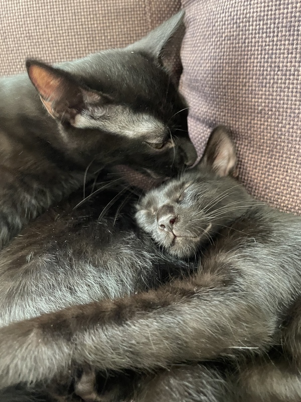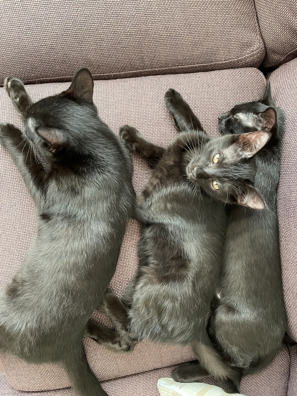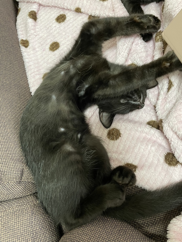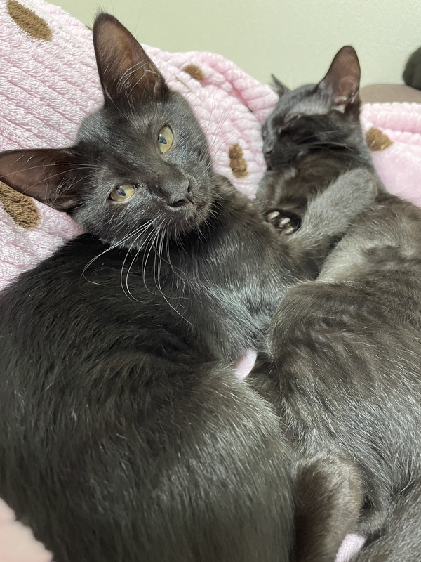 | 特徴(性格など) | オス1匹 メス2匹 の真っ黒な黒猫3匹です! 保護した時はシャーっと言っていましたが今は人馴れもして 好奇心旺盛で甘えん坊です。 膝やお腹の上でゴロゴロと甘えてきて 一緒に寝たりします。 よく食べよく遊びよく寝ます チュールと猫じゃらしが大好きで遊んで欲しい時は猫じゃらしを持ってきます。 |
