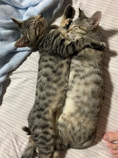 | 特徴(性格など) | 薄いキジトラ、尾長 おてんば娘ですが、他の猫のグルーミングをしてあげたりと優しい1面のある女の子です。 我が家に保護している子猫たちともすぐ仲良くなり、 成猫とも距離を保ちながら仲良くしています。 特に、1匹の女の子にはべったりでしっぽを絡ませながらいつも後を追っています。 お兄ちゃん猫こてつ君と仲が良く 寝る時は必ずそばに寄り添って寝ています。 猫同士で遊ぶのももちろん大好きですが 人間に遊んでもらうのも大好きです!! 満足すると布団の上で一休みをしたりと 見てて飽きない子です。 時より人に体をなすり付けながら にゃお と顔を見て鳴きます。そんな時はお腹がすいた合図が多いです。 猫エイズ、猫白血病共に(-) |